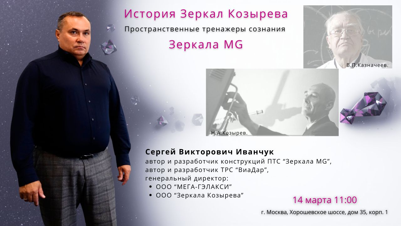 Приглашаем вас на встречу с Сергеем Викторовичем Иванчук — генеральным директором ООО "МЕГА-ГЭЛАКСИ", ООО "Зеркала Козырева", автором и разработчиком конструкций ПТС "Зеркала MG", ТРС "ВиаДар".