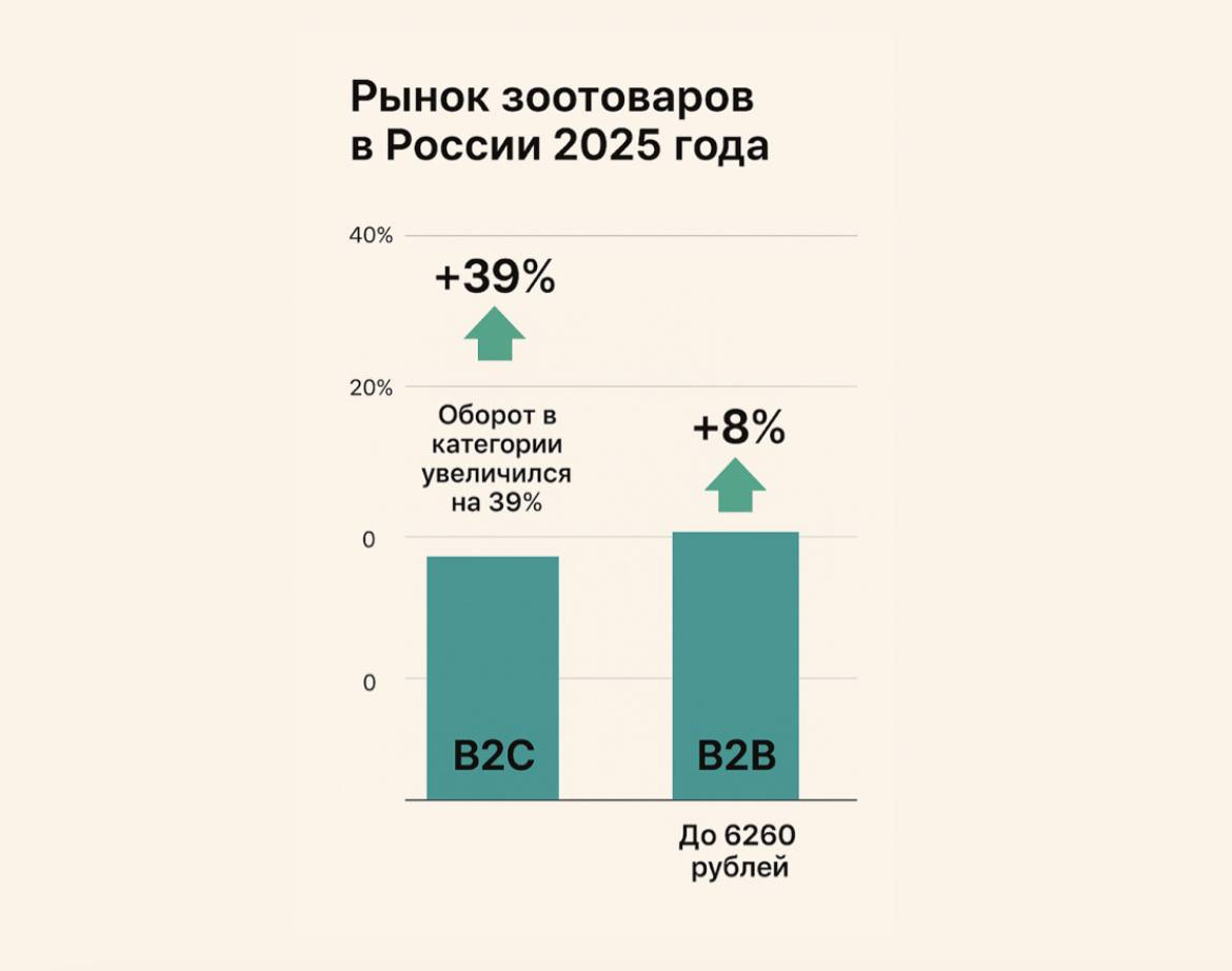 Рынок зоотоваров в России в 2025 году демонстрирует устойчивый рост и все большее расслоение стратегий в сегментах B2C и B2B. По данным отраслевых аналитиков, с марта по май оборот в категории увеличился на 39% по сравнению с тем же периодом 2024 года, а средний чек вырос на 8% — до 6260 рублей.