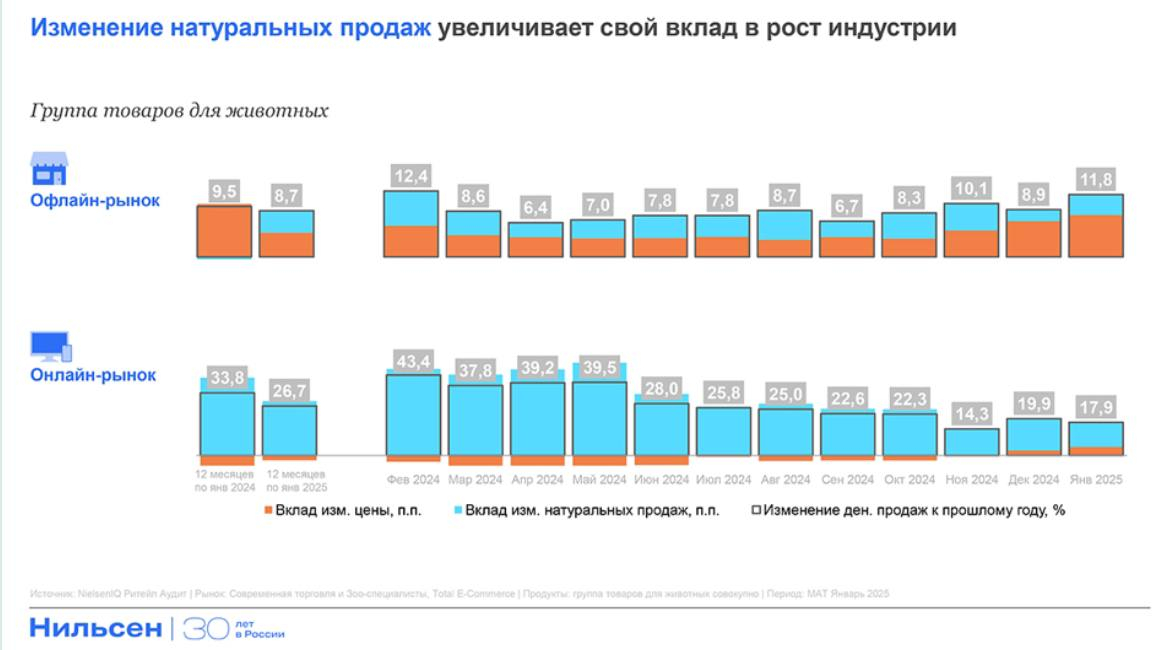 Средняя цена в офлайн-зоомагазинах выросла на 10,8%, в неспециализированной рознице — на 3,5%, тогда как в онлайне продолжала снижаться. Однако с декабря 2024 года фиксируется начало инфляции и в e-commerce.