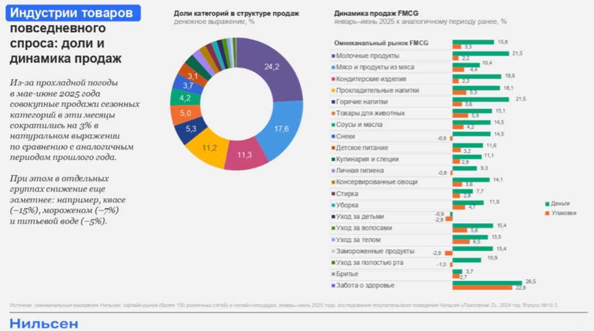 Рынок FMCG в России продолжает расти, несмотря на высокую инфляцию и заметное снижение потребительской уверенности. По данным компании «Нильсен», в I полугодии 2025 года общий рост составил 15,8% в денежном выражении. Основной вклад внесла инфляция (13,5 п.п.), однако и реальный спрос продемонстрировал позитивную динамику — +2,4 п.п.