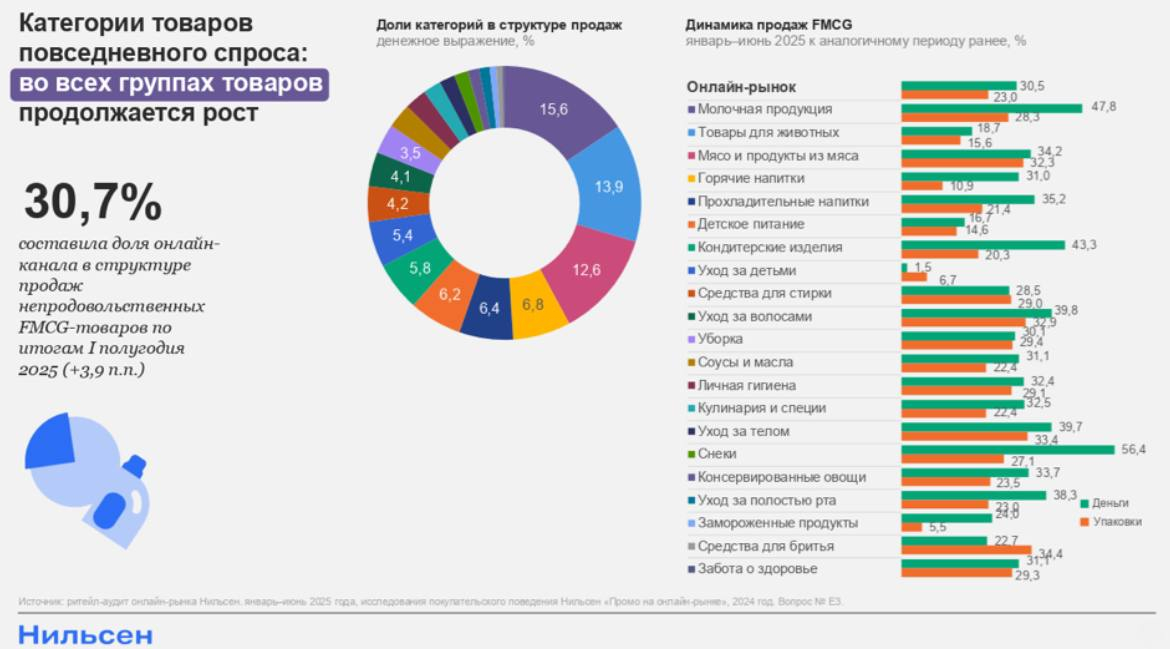 Среди драйверов роста особое место занимают товары для домашних животных, которые показали увеличение продаж на 15,1% в деньгах и 5,9% в упаковках. Более того, зоосегмент стал одним из лидеров в онлайн-торговле: рост составил 47,8% в денежном выражении и 32,3% — в упаковках, а доля категории в структуре онлайн-продаж FMCG достигла 32,8%.