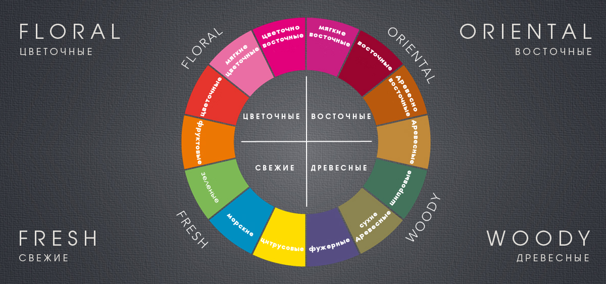 Какие бывают ароматы? Существует классификация ароматов, которую разработал Майкл Эдвардс в 1983 году, которая стала общепринятой. Представил он её только в 1992 году в наглядной форме, в виде «колеса ароматов». Классификация помогает понять характер, ориентироваться и находить аромат под свои предпочтения. В ней парфюмерные композиции разделяются на четыре «семейства»: древесные, цветочные, восточные и свежие. У каждой группы ароматов («семейства») есть подгруппы, они расположены по кругу так, чтобы похожие подгруппы находились по соседству и отражали плавные переходы между семействами. В классификацию не входят гурманские (карамель, шоколад) и минеральные (камни, металлы) ароматы, так как они появились позднее.