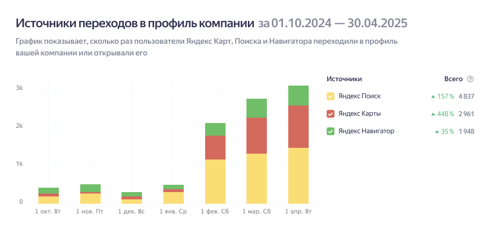 В статистике стоит отметить достаточно большое количество трафика из Яндекс Навигатора, но трафика из поиска карт было в районе 300.