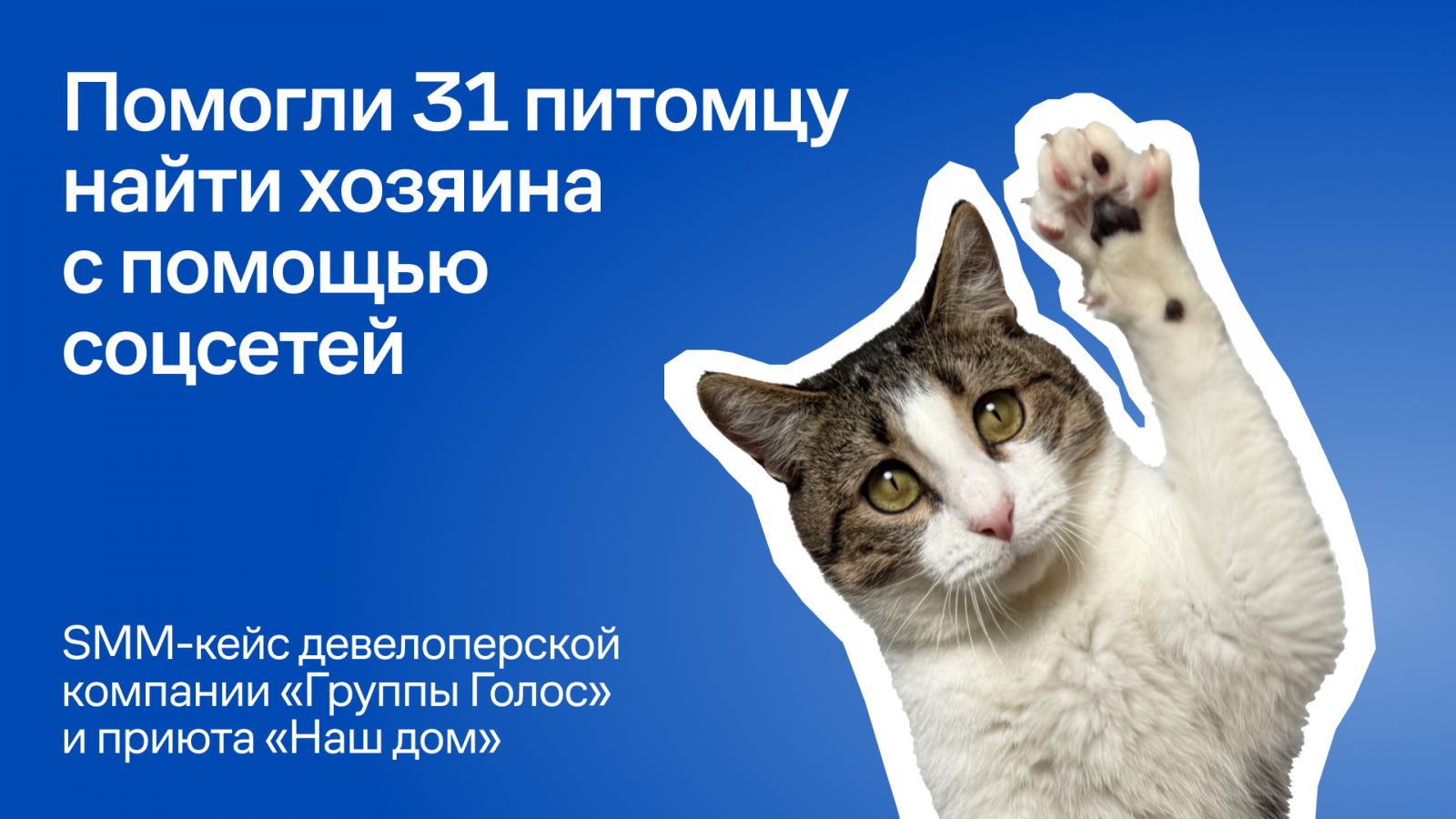 Осенью 2024 года «Наш Дом» и девелоперская компания «Группа Голос» объединили усилия в проекте «Счастье можно приютить». Нам предстояло через социальные сети застройщика доказать, что стать хозяином кота или кошки — это правильное решение.