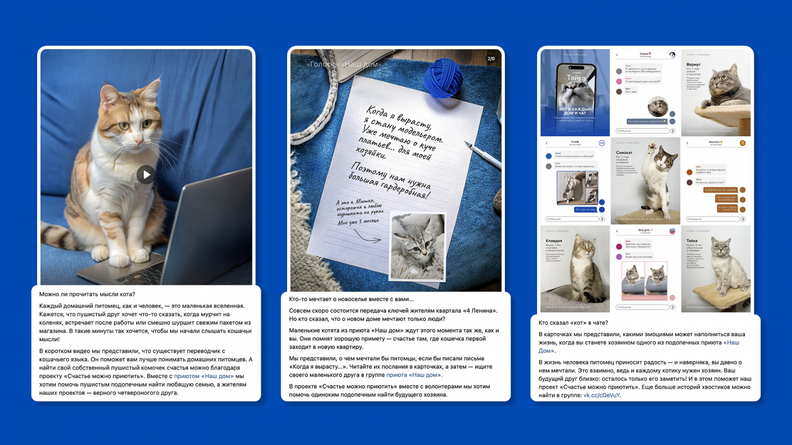 Мы писали письма хозяину «от первого лица». Так, как мог бы написать их кот или кошка, если бы они умели говорить, словно ребенок. Показывали, что одинокий питомец из приюта тоже испытывает чувства и может мечтать о новом комфортном доме.