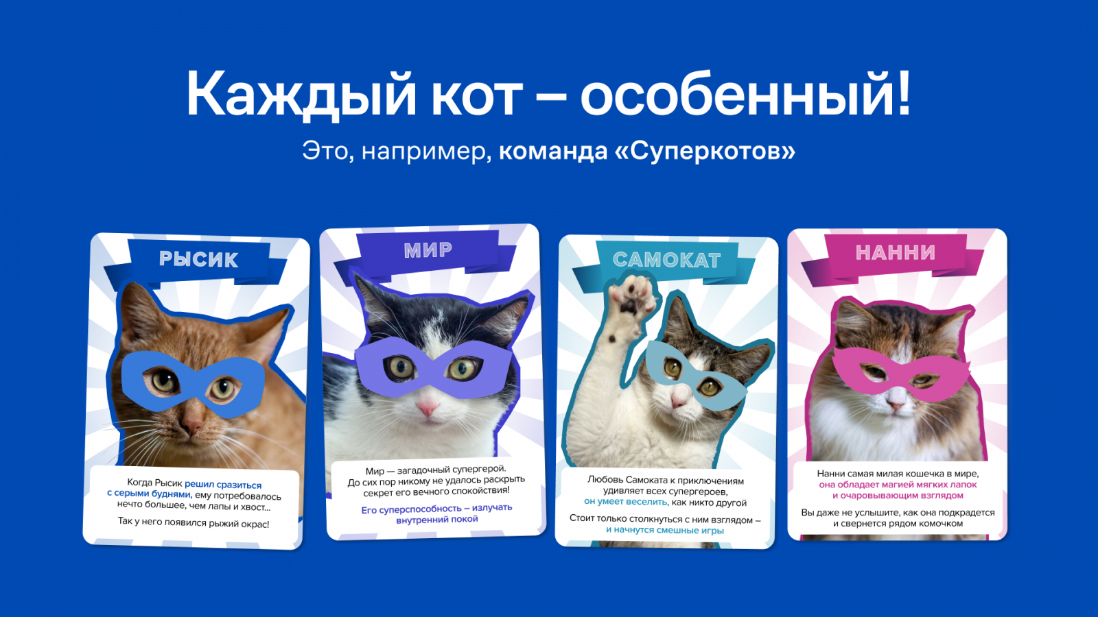 Мы развивали мысль об уникальности характера каждого кота и кошки. Постепенно публикации становились новым сюжетом кино или историей о Супервселенной, в которой главные герои — питомцы. За основу по-прежнему брали реальный характер животных и придумывали оригинальный сценарий, который может заинтересовать будущего хозяина.