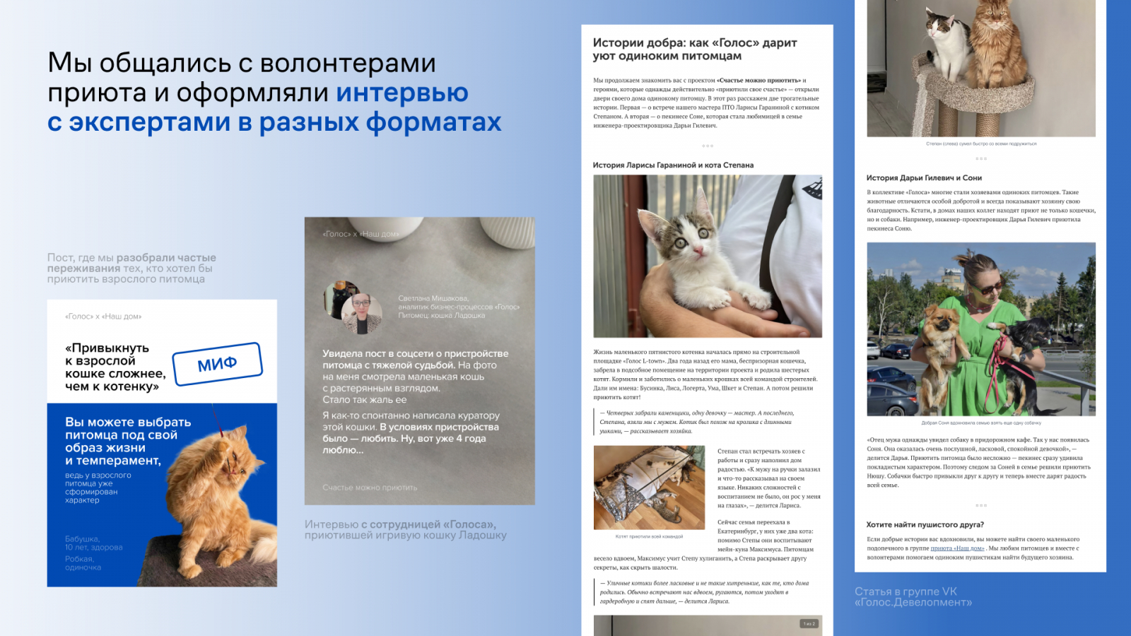 Выстраивать эмоциональную связь с аудиторией мы продолжили с помощью лайфхаков и реальных историй. В статьях и интервью мы делились трогательными воспоминаниями людей, которые приютили питомца.