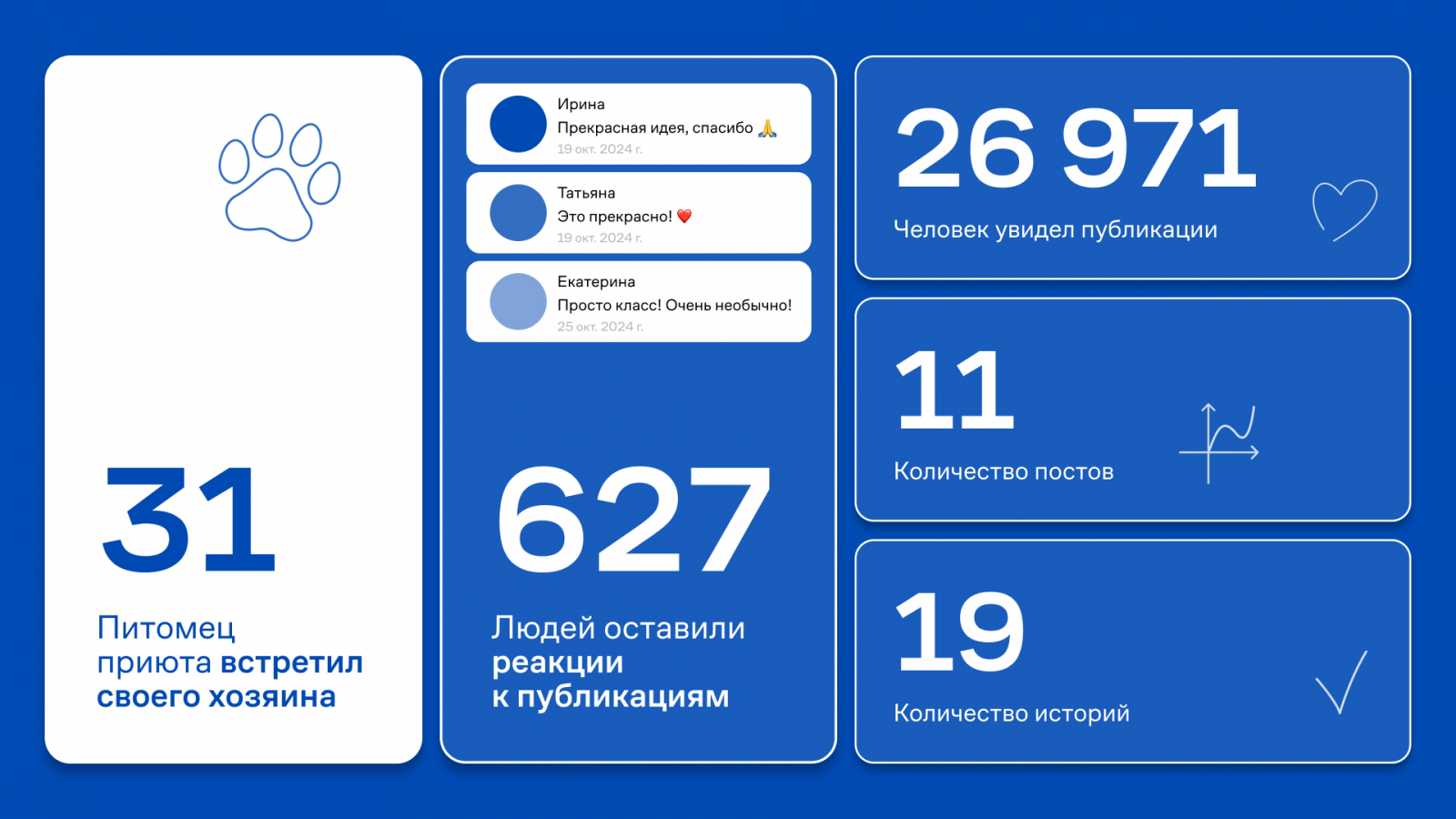 Всего за 2 месяца мы прошли от стадии идеи до разработки и выпуска 12 креативных публикаций. За это время в добрые руки удалось пристроить 31 питомца.