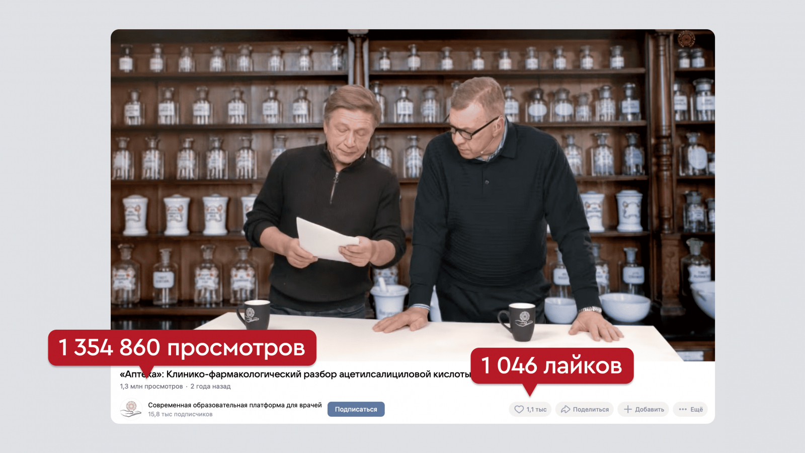 Выстроили еженедельный цикл привлечения аудитории к просмотру эфиров. Увеличили количество просмотров видеороликов с 500-1 000 до 200 000 и достигли рекордных 1.3 млн просмотров видеозаписи эфира с разбором ацетилсалициловой кислоты.