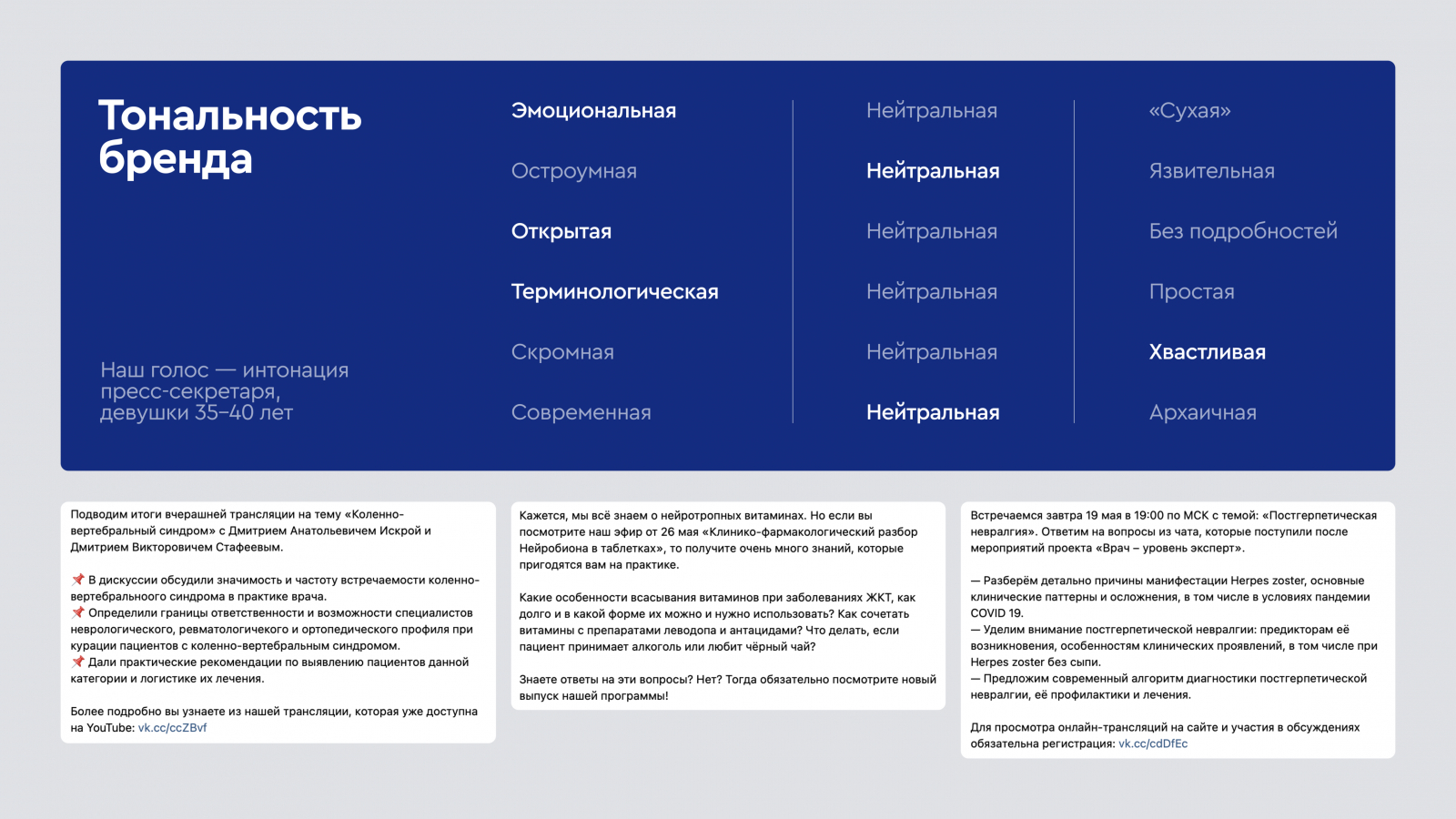 Мы сформулировали главные ценности в тональности бренда. Контент в социальных сетях Современной образовательной платформы стал в глазах аудитории своего рода работой пресс-секретаря. Мы анонсировали каждое мероприятие так, как могла бы рассказывать о нем девушка — «правая рука» медицинского руководителя.