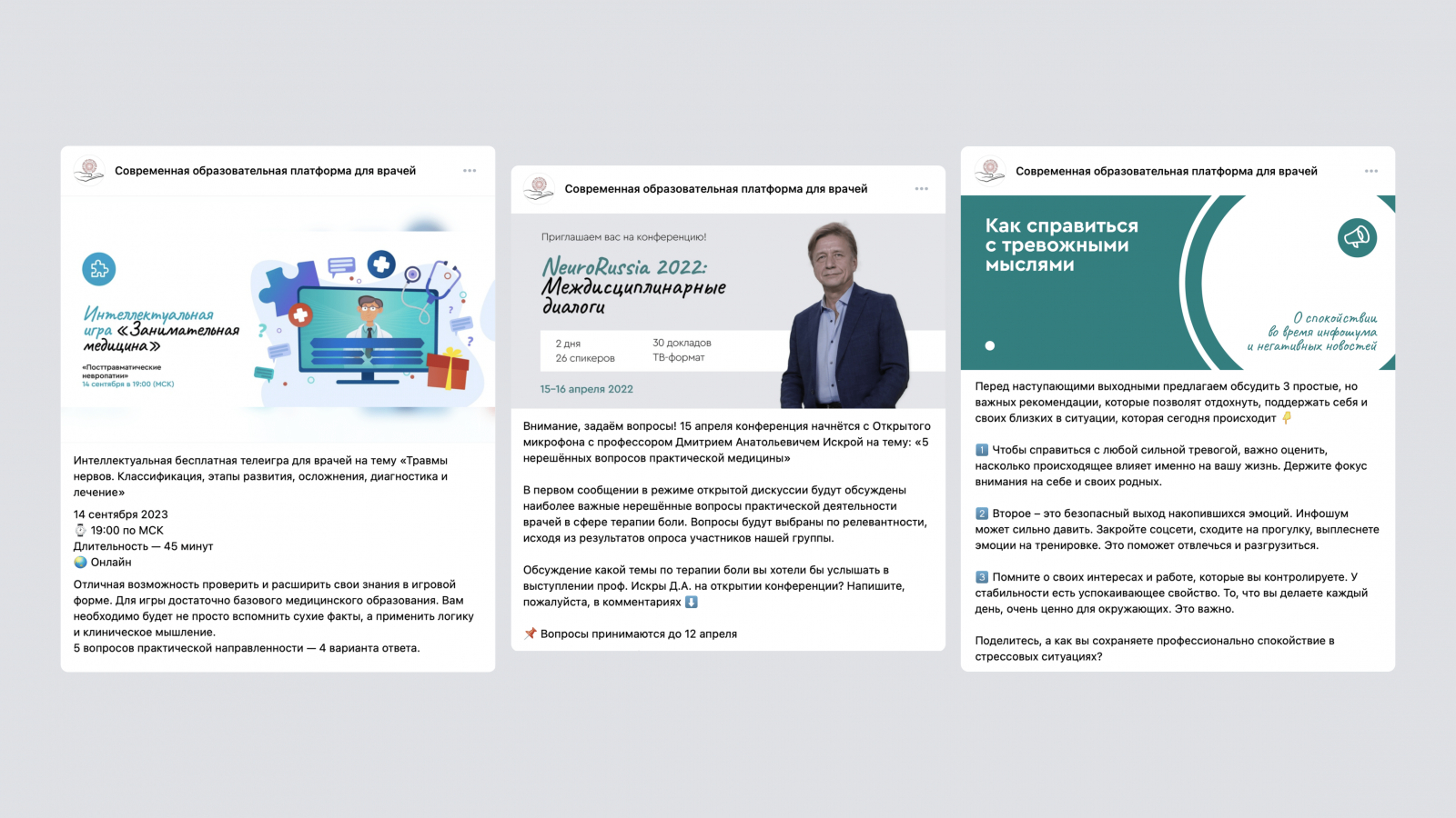 Мы создали рабочий канал продвижения образовательной платформы и превратили группу ВКонтакте в большее, чем информационный ресурс. Сообщество клиента стало популярным источником поддержки медицинских специалистов, где врачам комфортно делиться знаниями и задавать вопросы более опытным коллегам-профессионалам.