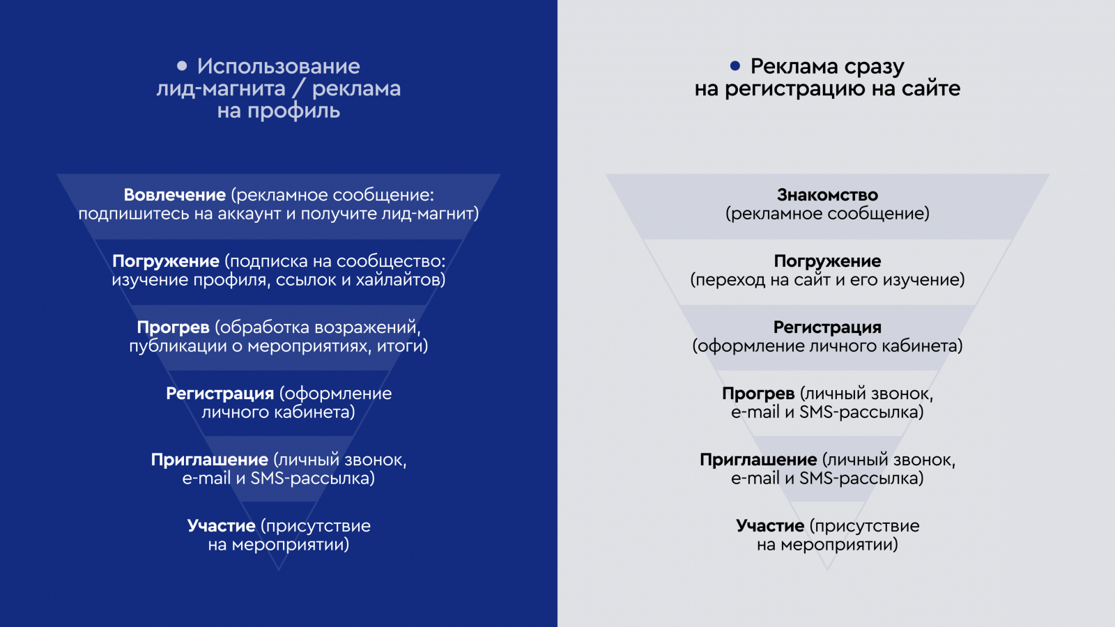 На основе контент-стратегии мы приступили к проработке вариантов воронки продаж — в случае с НКО — воронки «вовлечения». Важным условием работы было привлечение подписчиков к регистрации на вебинары через сайт образовательной платформы. Мы предложили два варианта воронки — с использованием рекламы на профиль сообщества и на регистрацию на сайте. В дальнейшем свою эффективность показал первый вариант — с его помощью мы привлекли к регистрации более 2 800 зрителей.