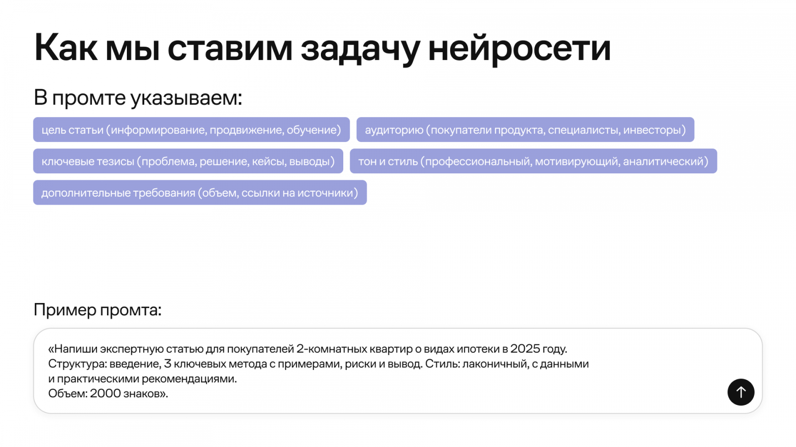 Важно сформулировать четкий и детализированный промт, чтобы получить качественную экспертную статью. Формулируем задачу со всеми нюансами так, как если бы мы отдавали ее начинающему копирайтеру-джуну.