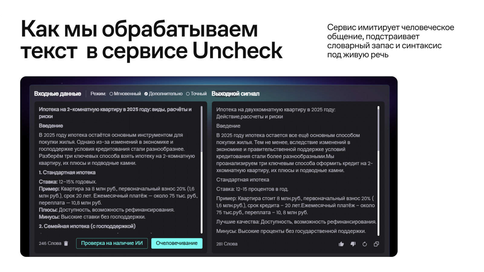 С помощью нейросетей мы не только создаем тексты, но и «гуманизируем» их. После первичной генерации текста отправляем его в сервис Uncheck — этот инструмент помогает сделать так, чтобы статья «зазвучала» от лица человека. Сервис включает семь детекторов ИИ и собственную модель для рерайта.