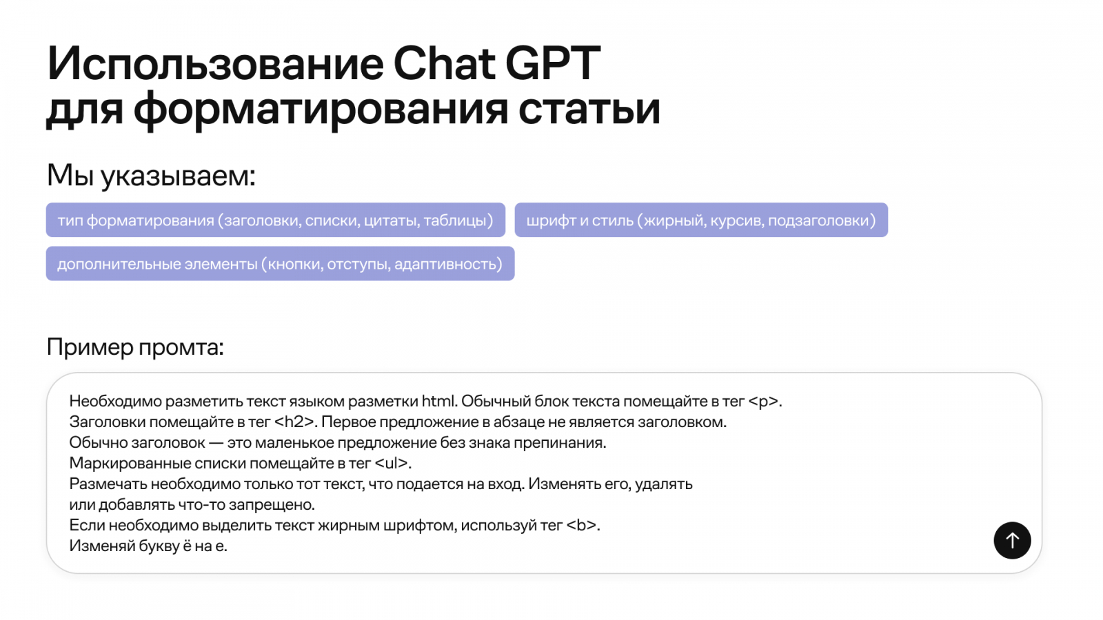 Мы отправляем статью в Chat GPT с запросом прописать код форматирования для встраивания текста. Это может быть код разметки HTML или стили для платформы публикации (например, WordPress).
