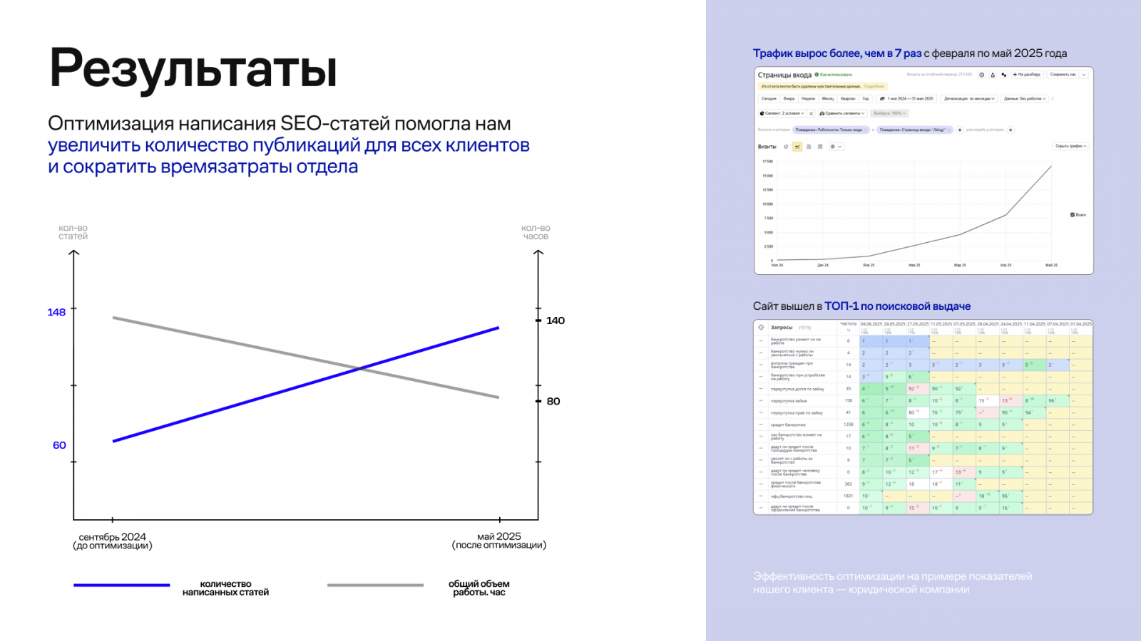 Работа с более специализированной тематикой требует больше времени. Но оптимизация позволила выделять специалисту дополнительные часы на брифинг клиента, глубокий анализ сферы бизнеса и целевой аудитории.
