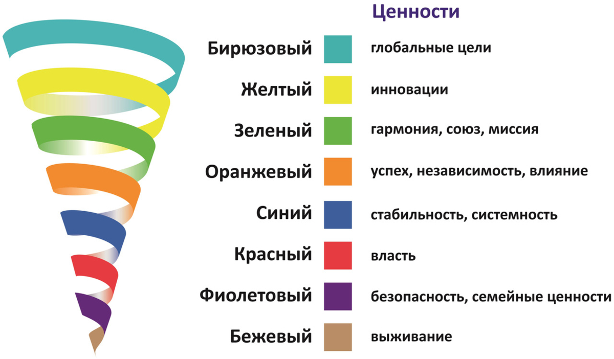 - Желтый и бирюзовый уровни — системность и миссия. Людям этого уровня важна целостность, миссия, смысл, развитие, свобода через ответственность. Они хотят полноценно реализовать потенциал, решать сложные задачи, быть частью чего-то большего.