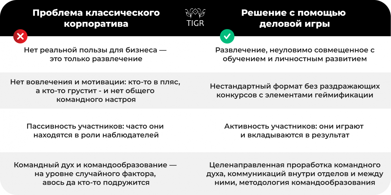 Мы в TIGR разрабатываем авторские форматы корпоратива, чтобы вы совмещали приятное с полезным. Индивидуальная разработка деловой игры под ваш корпоратив и проведение под ключ потребует бюджета от 250 000 ₽ — за эту сумму вы в одном флаконе получите все полезные эффекты тимбилдинга, тренинга и корпоратива.