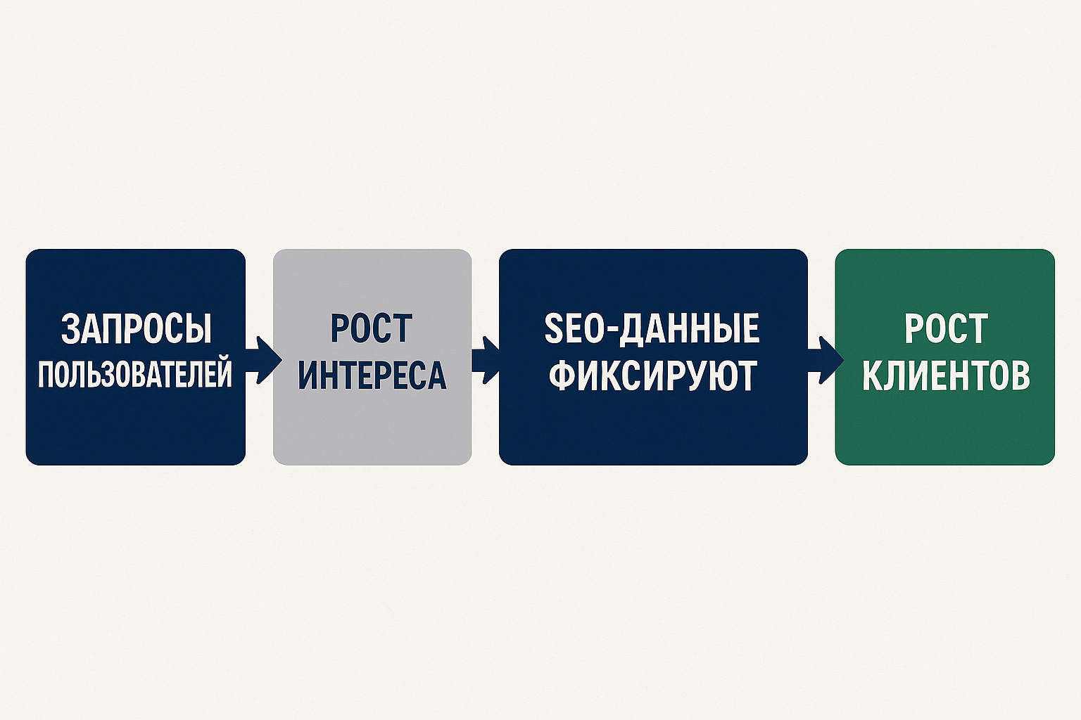 Поисковая аналитика для бизнеса — это первый, внешний слой данных о нише. Она работает как BI-система, собирает разрозненные сигналы и сразу показывает, куда поворачивает рынок. В запросах это видно особенно ясно. SEO анализ: