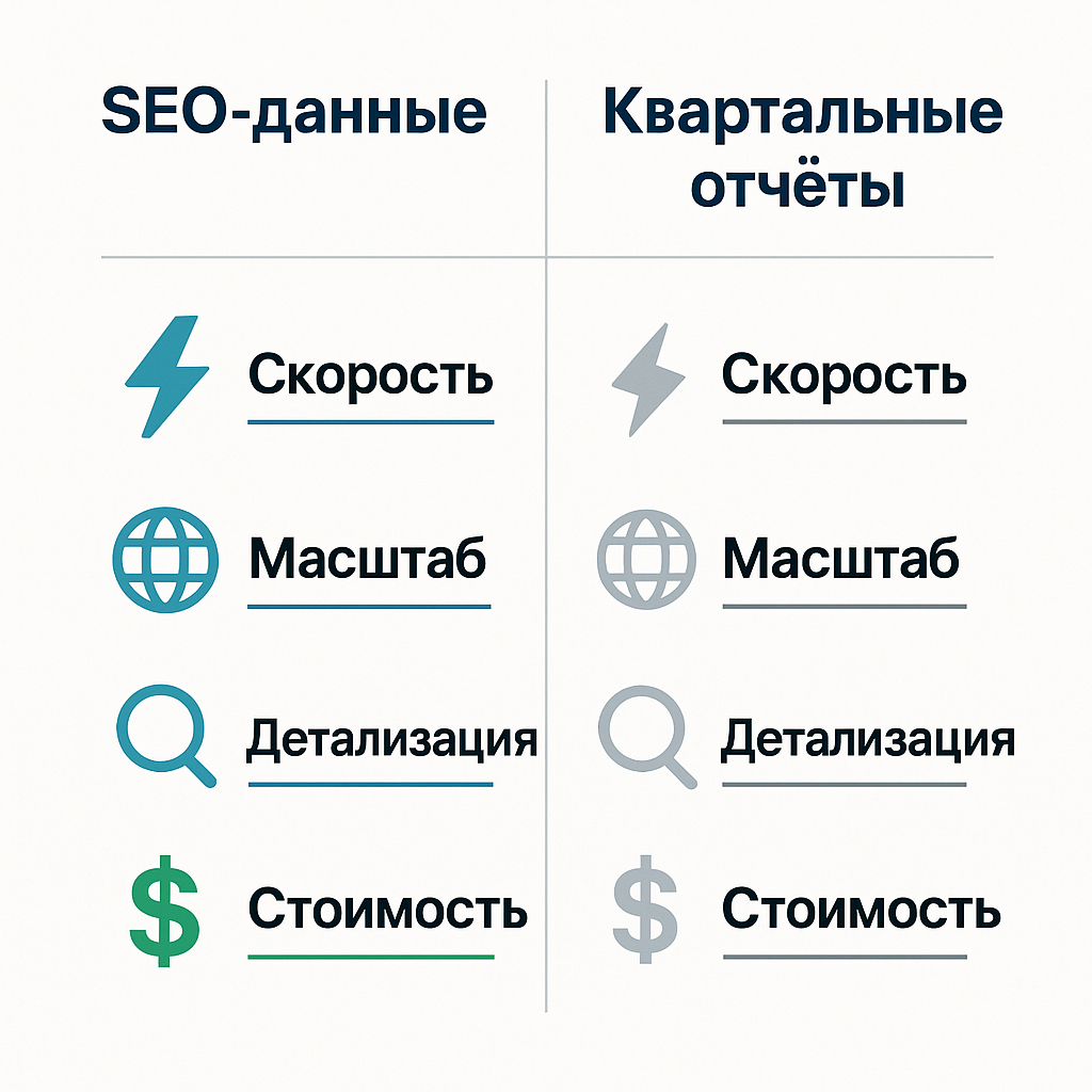 ↔️ И самое главное — применение. SEO-данные подходят для быстрых управленческих решений, когда важно среагировать в моменте. Отчёты же полезны для стратегического планирования, но всегда с опозданием.