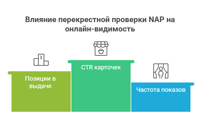 Яндекс и Google используют перекрестную проверку NAP (Name, Address, Phone). Когда адрес и телефон совпадают в карточке, на сайте и в каталогах, система помечает бизнес как подтвержденный и повышает доверие. Это напрямую влияет на CTR карточек, позиции в выдаче и частоту показов.