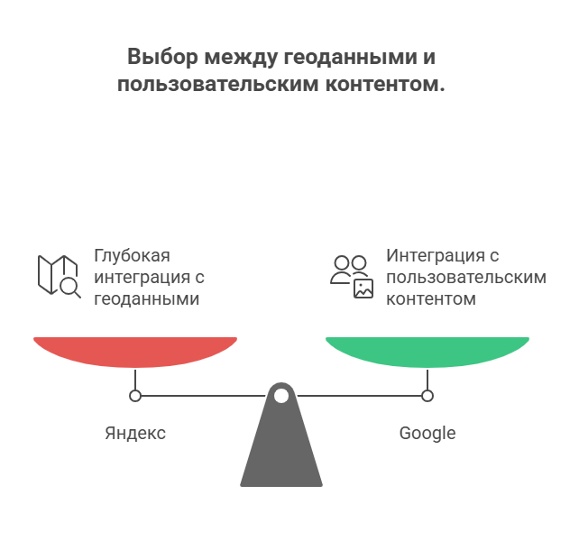 🔍 Разница в подходе: Яндекс глубже интегрирован с геоданными и коммерческими картами, а Google – с пользовательским контентом (фото, отзывы, маршруты).
