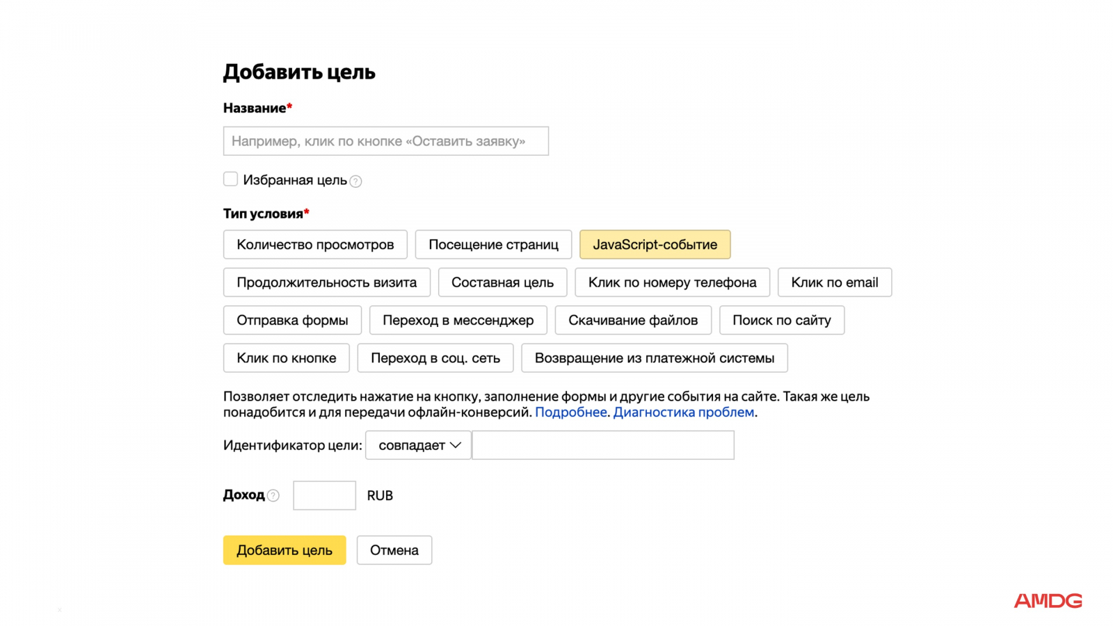 Настраиваются вручную.Чаще всего используется JavaScript-событие, «Посещение страницы» или составная цель. Примеры: отправка формы обратной связи, посещение страницы «спасибо», отслеживание добавления товара в корзину.