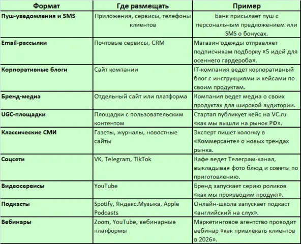 Контент-маркетинг не ограничивается только статьями. У компаний десятки способов рассказать о себе и быть полезными клиентам. Главное — выбрать те форматы и площадки, которые подходят именно вам и вашей аудитории.