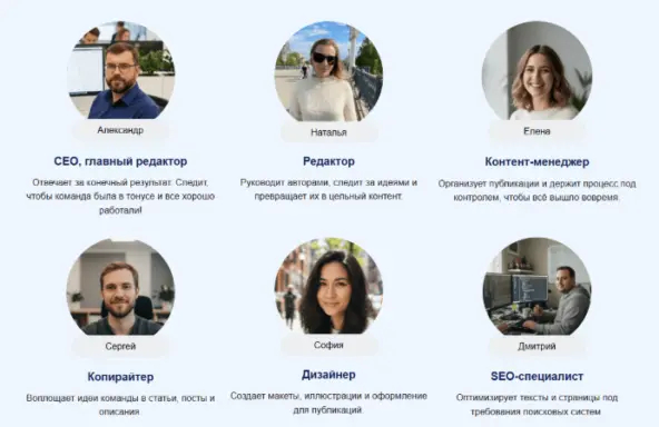 Чтобы контент-маркетинг работал, нужно не одно усилие, а целая связка специалистов. В агентстве есть команда, где каждый отвечает за свой участок: