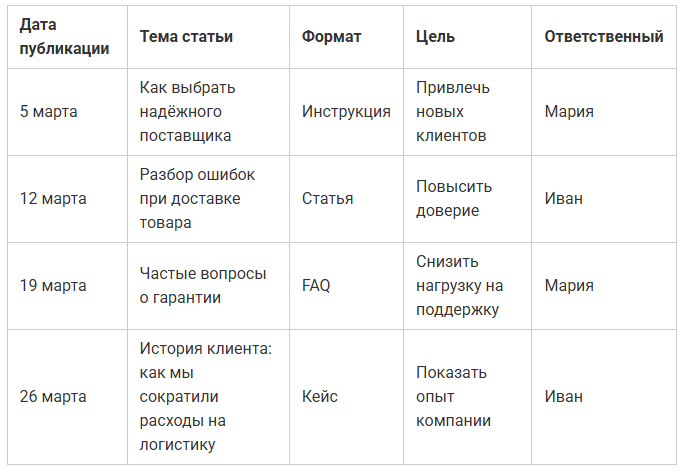 Начать можно с простого. Создайте таблицу, где будут темы, даты публикаций, формат статьи и ответственный. Даже минимальный план поможет выстроить ритм и избежать суеты.