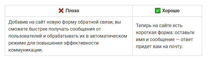 ✅ Совет: перечитывайте текст и убирайте слова, без которых смысл не меняется. Если фраза выглядит красиво, но ничего не дает — выливайте воду.