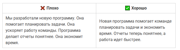 Во втором варианте мысль та же, но текст читается легко: короткие фразы, четкая структура, ритм.
