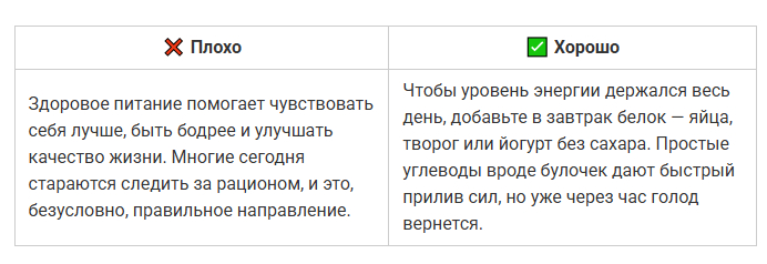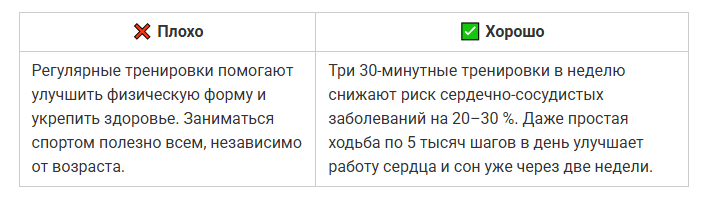 ✅ Совет: заменяйте размытые слова цифрами, фактами и конкретными действиями. Чем точнее формулировка, тем больше доверия к тексту.