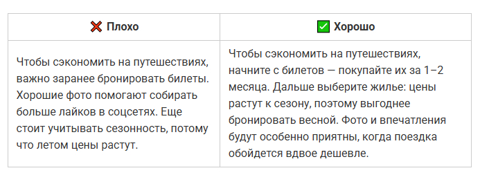 Во втором примере логика выстроена пошагово: сначала билеты, потом жилье, потом эмоции. Читателю не нужно додумывать — он просто идет по маршруту.