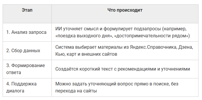 По сути, искусственный интеллект не заменяет поиск, а помогает сориентироваться быстрее. Алгоритм анализирует смысл запроса, выбирает релевантные материалы и показывает сводку в верхней части страницы. Ниже остаются обычные результаты — сайты, откуда взята информация.