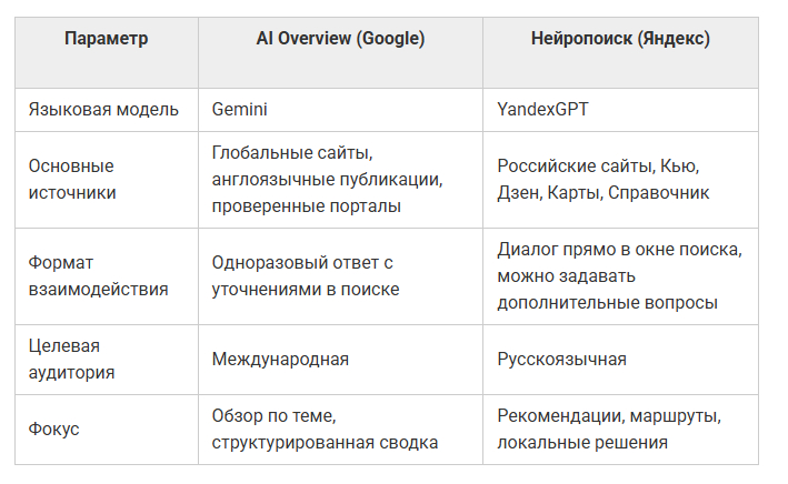 AI Overview делает ставку на скорость и универсальность, а Нейропоиск — на контекст и локальную пользу. Google стремится дать короткий ответ, который сэкономит время. Яндекс, наоборот, старается сопровождать пользователя по всей цепочке поиска: от вопроса до готового решения.