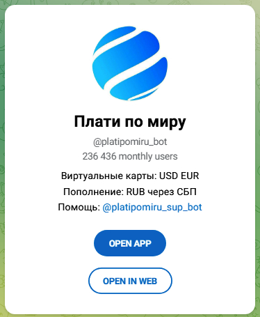 Плати по миру - сервис, который за пару минут выпускает международную виртуальную карту Visa/Mastercard в долларах или евро через Telegram-бот. Карта подходит для оплаты зарубежных подписок (Netflix, Spotify, ChatGPT), покупок в иностранных интернет-магазинах и расчётов в поездках.