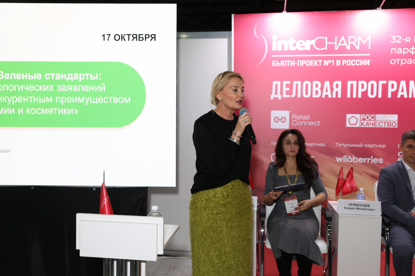 В рамках выставки состоялась ключевая пленарная сессия: «Зеленые стандарты: как достоверность экологических заявлений становится новым конкурентным преимуществом». Мероприятие, организованное Роскачеством совместно с InterCHARM, собрало ведущих экспертов государственных органов, бизнеса и институтов развития для обсуждения вызовов и возможностей на стремительно растущем рынке «зеленой» продукции. Обсуждение показало, что развитие «зеленых» стандартов в России набирает серьезные обороты, формируя надежную основу для доверия потребителей и здоровой конкуренции среди производителей. Орган по сертификации «Роскачество — Органик» сертифицировал первые фермы и участки дикого сбора на Камчатке и Сахалине. Группа компаний Natura Siberica получила сертификаты на производственные площадки в Камчатском крае и Сахалинской области, которые подтвердили соответствие органическому статусу ГОСТ. Роскачество также сертифицировало первого производителя в категории профессиональной «зеленой» бытовой химии из Москвы. Им стало многофункциональное специализированное моющее средство для профессионального, промышленного и бытового использования с маркировкой Sovtclean, производителем которого является ООО «Современные технологии». Торжественное вручение прошло во время пленарной сессии выставки InterCHARM.