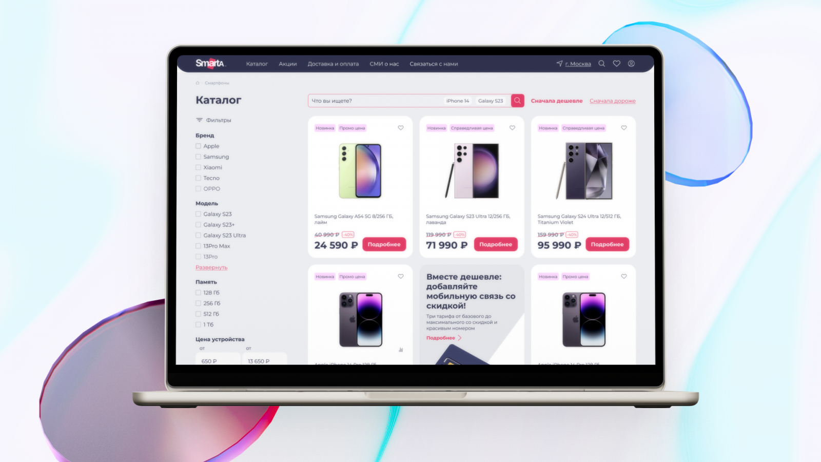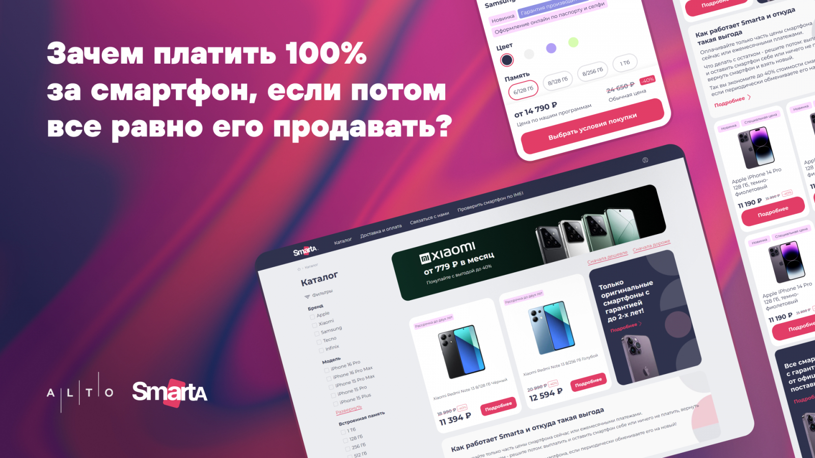 Smarta — это новый способ владеть смартфоном: клиент платит 60–70% стоимости сейчас, а через 1–2 года решает — доплатить остаток или сдать устройство обратно. При этом сервис «наследует» логику интернет-магазина, в нем есть каталог, фильтры, оформление заказа, личный кабинет.