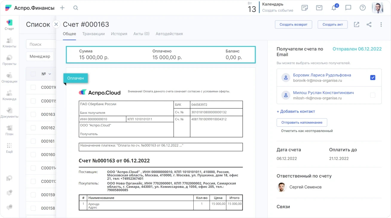 Формирование и отправка счета с актом теперь занимает не больше минуты. Проектный менеджер может сразу увидеть статус оплаты и напомнить клиенту при необходимости.