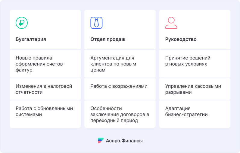 - Проведите обучение бухгалтерии, финансового отдела, продаж и юристов.