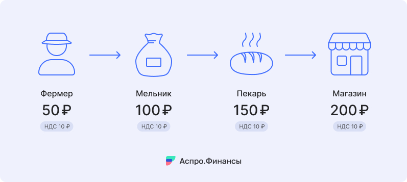 - Пекарь выпекает хлеб и продает булку магазину за 150 руб. (НДС = 30 руб.). Пекарь вычитает НДС мельника (20 руб.) и платит в бюджет разницу: 30 - 20 = 10 руб.