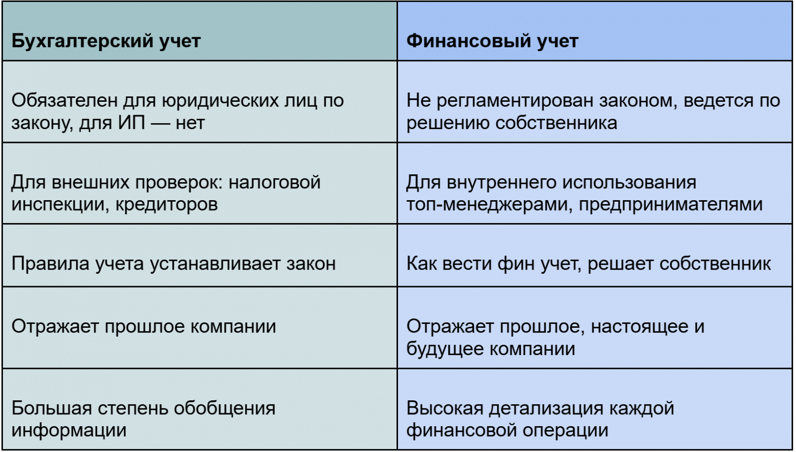 Таблица сравнивает два способа, как вести финансы в бизнесе — с помощью бухгалтерского и финансового учета.