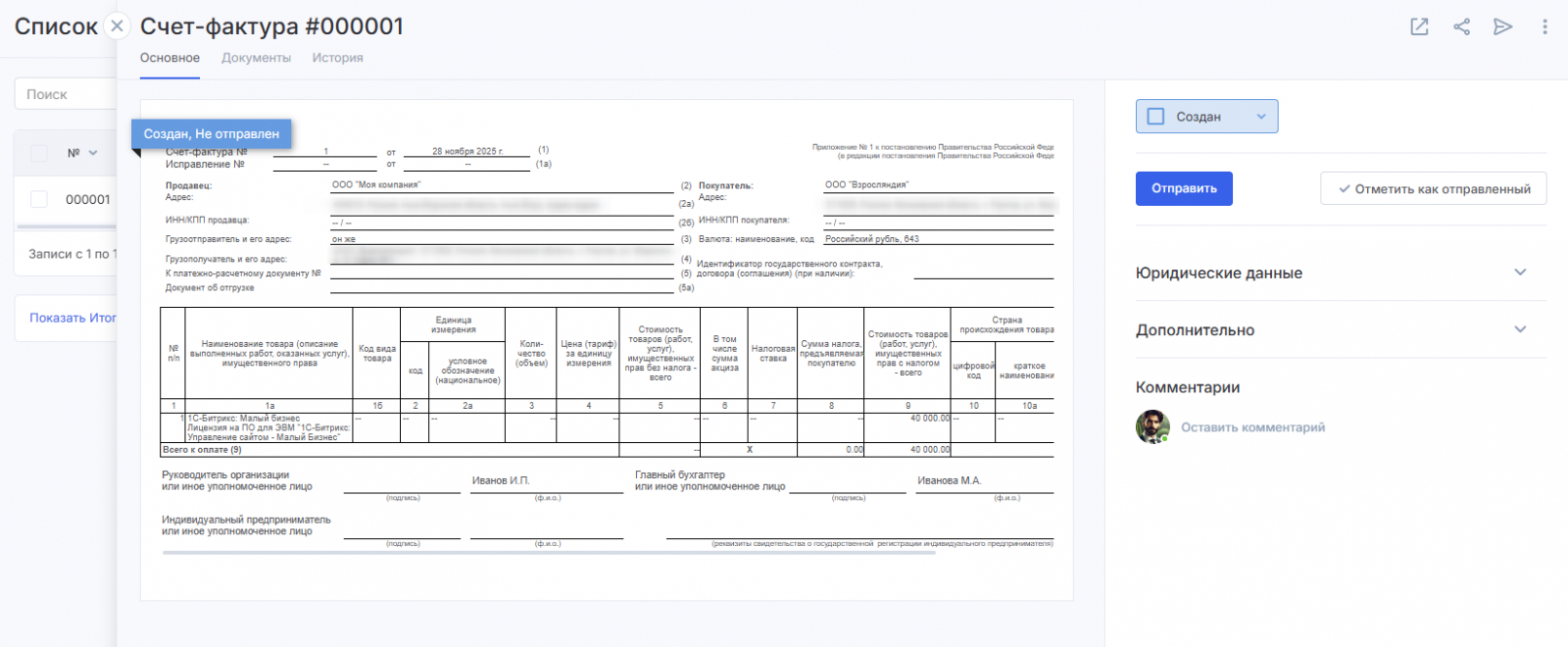 Счет-фактура фиксирует сумму предоплаты и НДС, а также дает право на вычет после отгрузки. Документ обязателен при работе с НДС и напрямую влияет на корректность налогового учета. Для компаний, которые впервые начинают работать с налогом, надежная автоматизация особенно важна.