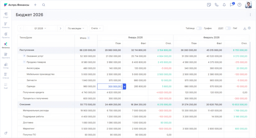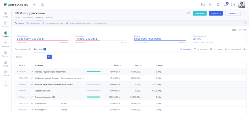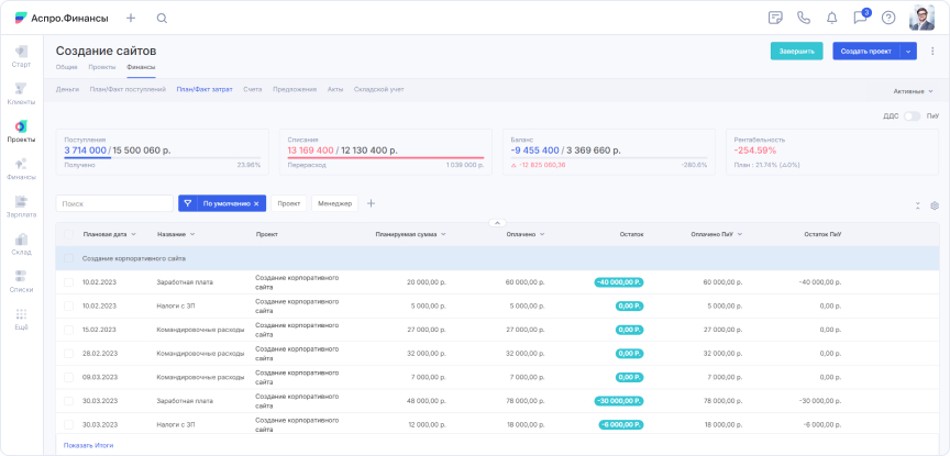 Почему выбор пал на Аспро.Финансы. Павел изучил возможности сервиса и отзывы. Система предоставляла весь необходимый функционал: проектное бюджетирование, интеграцию инструментов, учет без сторонних программ и объединение старых таблиц. Павел убедил руководство: внедрение займет мало времени, а выгода быстро окупит затраты.