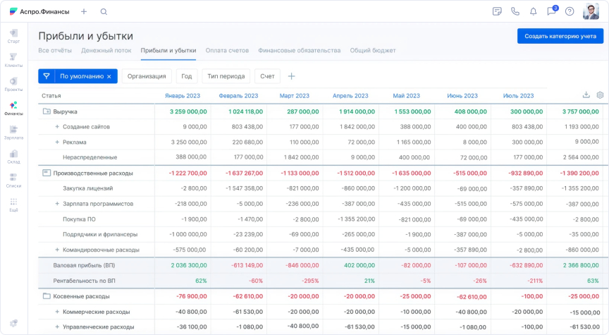 Какая стояла задача. Агентство работает проектно: деньги должны учитываться по каждому клиенту и маркетинговой кампании. Также требовалась комплексная аналитика по направлениям работы, юрлицам и контрагентам.