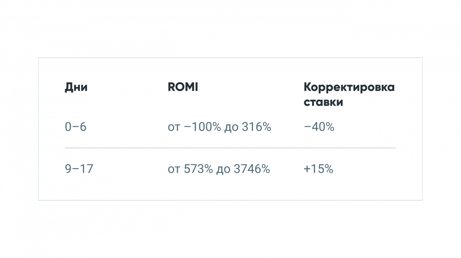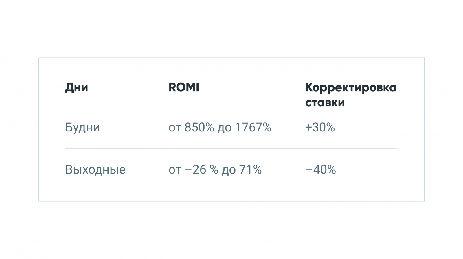 Дальше — конкретика: как именно изменение расписания помогло поднять ROMI и убрать «пустое» время показов. Аналитика показала, что лучше всего реклама отрабатывает в будни — ROMI стабильно держался в плюсе. Поэтому ставки на эти дни оставили без изменений. А вот в выходные эффективность проседала, и часть бюджета просто сгорала. Решили не тратить впустую — снизили ставки на 40 %.