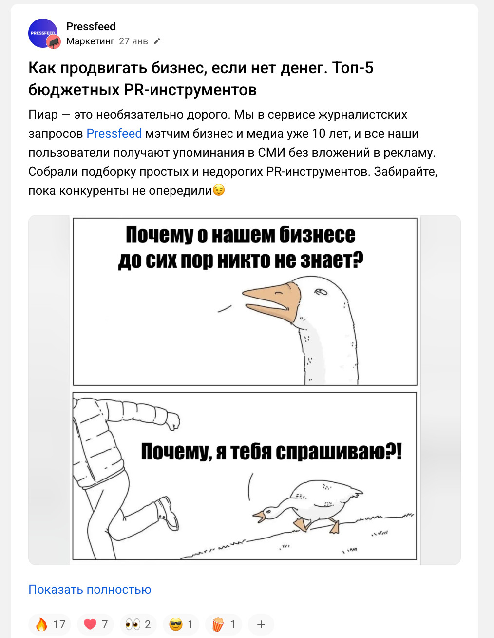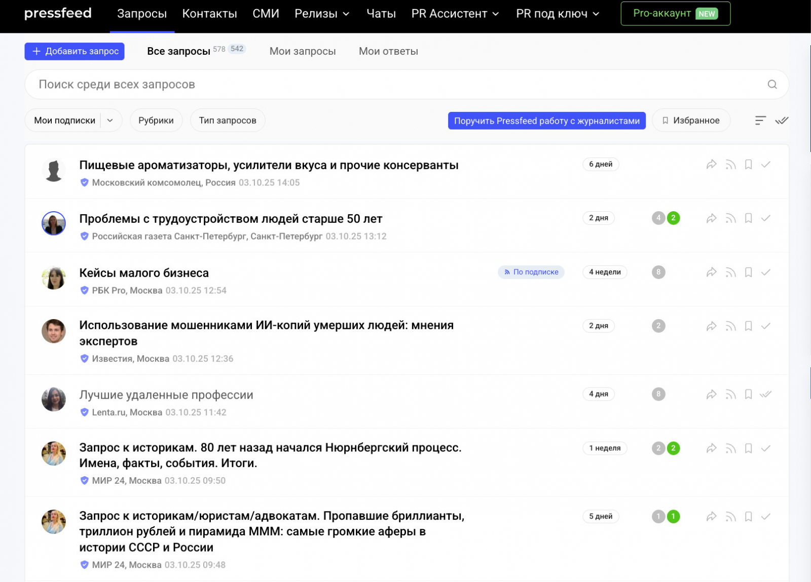 На Pressfeed журналисты из «Коммерсанта», «Известий», РБК, МИР24, Forbes и сотен других медиа публикуют вопросы по темам; эксперт или компания отправляет короткий по делу комментарий — и, если он подходит, попадает в материал бесплатно. Для бизнеса это простой способ получать упоминания в СМИ без больших бюджетов и агентств.
