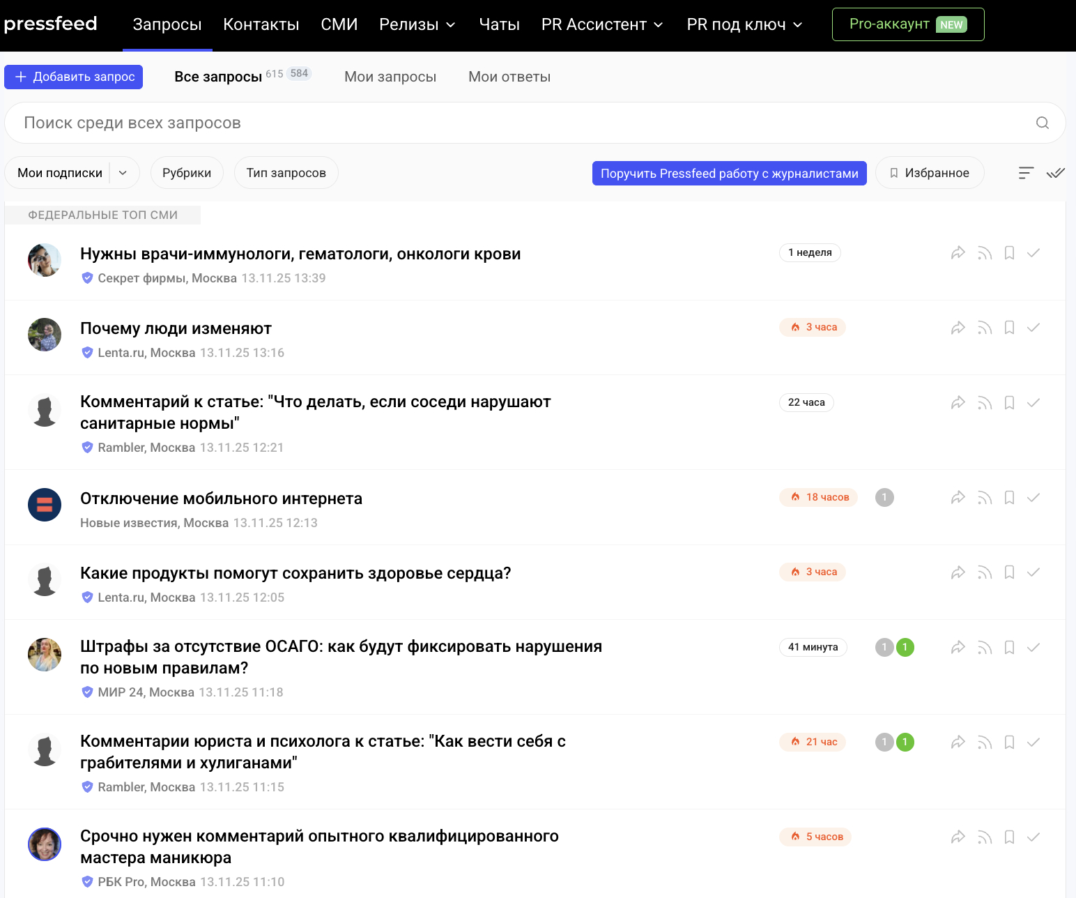 И попасть туда реально — бесплатно, без пиар-агентства и связей. Есть сервис Pressfeed, где журналисты публикуют запросы на комментарии и ищут экспертов по разным темам: «Нужен HR, который расскажет, как удержать сотрудников». «Ищем маркетолога с кейсом провального запуска». «Нужен юрист по трудовому праву».