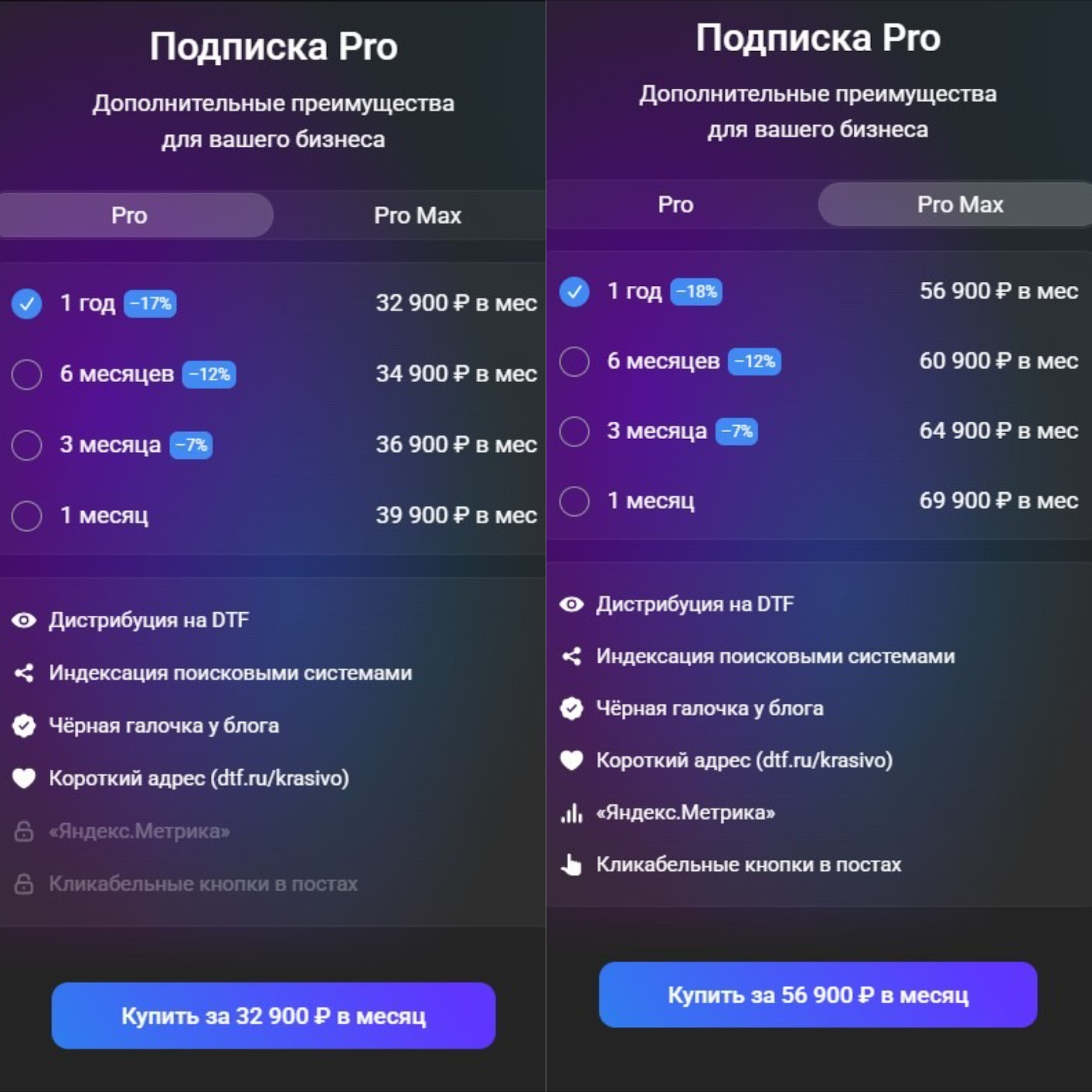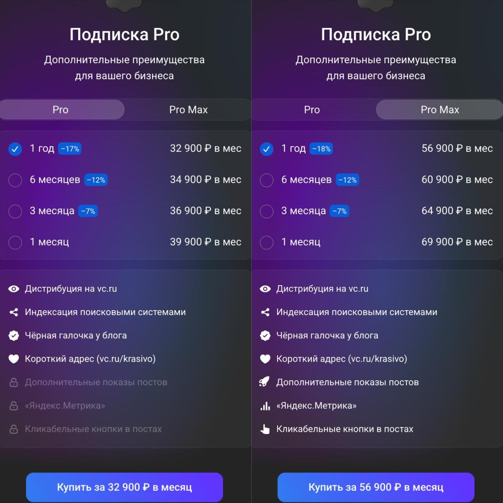 Платно: подписки «Pro» и «Pro Max» для корпоративных блогов дают расширенное продвижение статьи внутри платформы, дистрибуцию по категориям, короткий адрес для удобной ссылки и индексацию в поисковых системах. Цены: «Pro» — от 32 900 ₽/мес, «Pro Max» — от 56 900 ₽/мес.